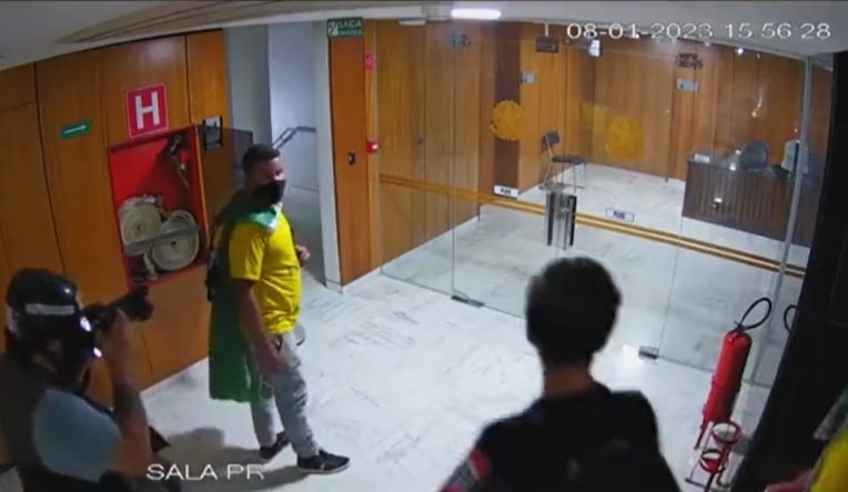 As imagens divulgadas pelo Gabinete de Segurança Institucional (GSI) revelaram mais detalhes da ação que ocorreu dentro do Palácio do Planalto em 8 de janeiro. Em um dos vídeos, os vândalos tentam acessar a antessala da Presidência. Antes da invasão um detalhe curioso chama a atenção. O homem, vestido com uma camiseta amarela e uma bandeira do Brasil — com o rosto coberto por uma máscara —, espera a presença de um cinegrafista para “filmar” a ação.