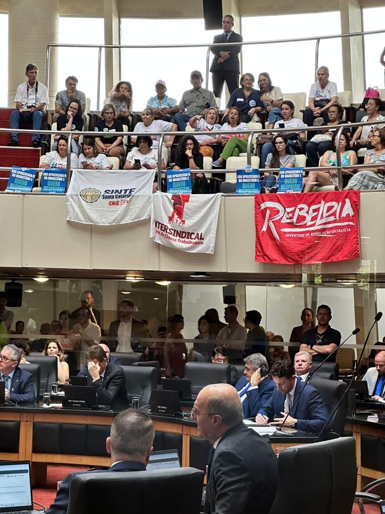 Os servidores sindicalizados estavam na Alesc para acompanhar a votação do Projeto de Lei Complementar (PLC) 31/2023, do Poder Executivo, que faz alterações na previdência dos servidores públicos estaduais.
